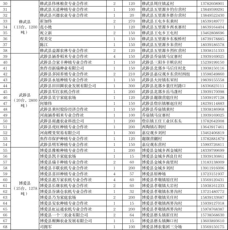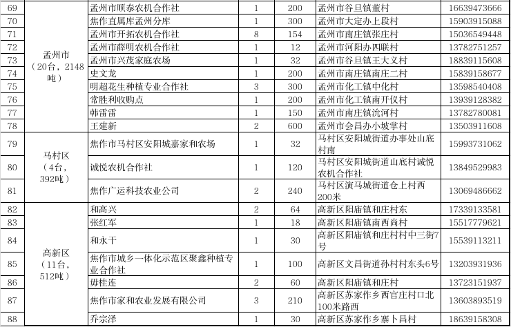为方便广大农户粮食收获后及时烘干,现将焦作市粮食烘干机分布情况予以公布。农户可根据所在地区,就近联系烘干点进行粮食烘干服务。